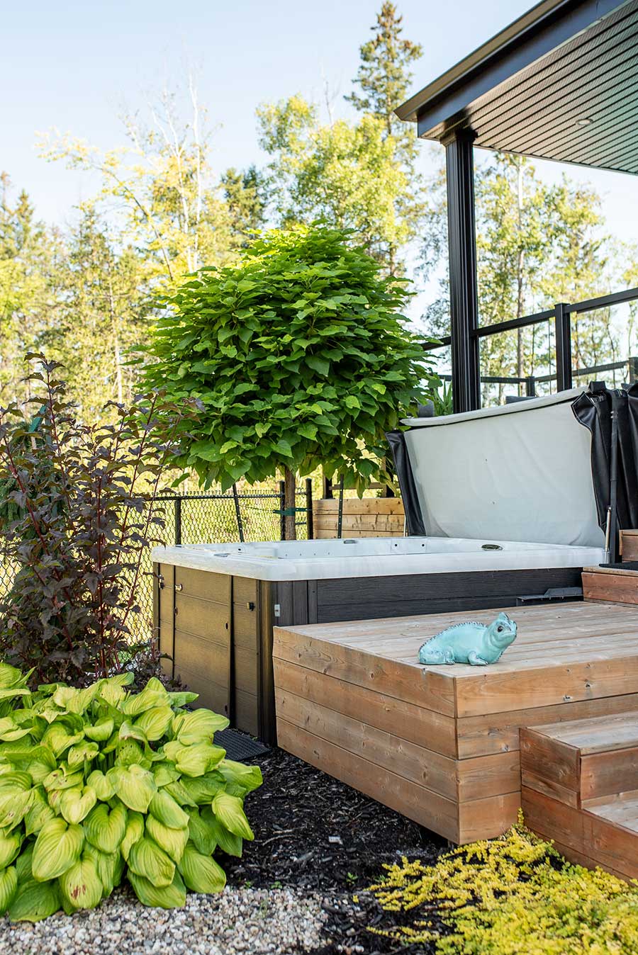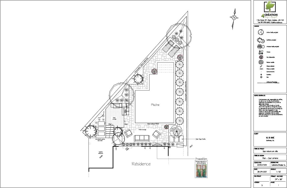 Les propriétaires souhaitaient intégrer un spa, une piscine, un sauna en forme de baril, un cabanon, un espace lounge, une zone repas, un espace foyer, tout en préservant l'intimité, le tout sur un terrain de forme triangulaire, limitant l'espace disponible.