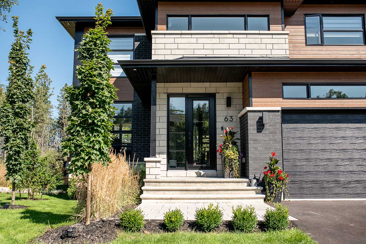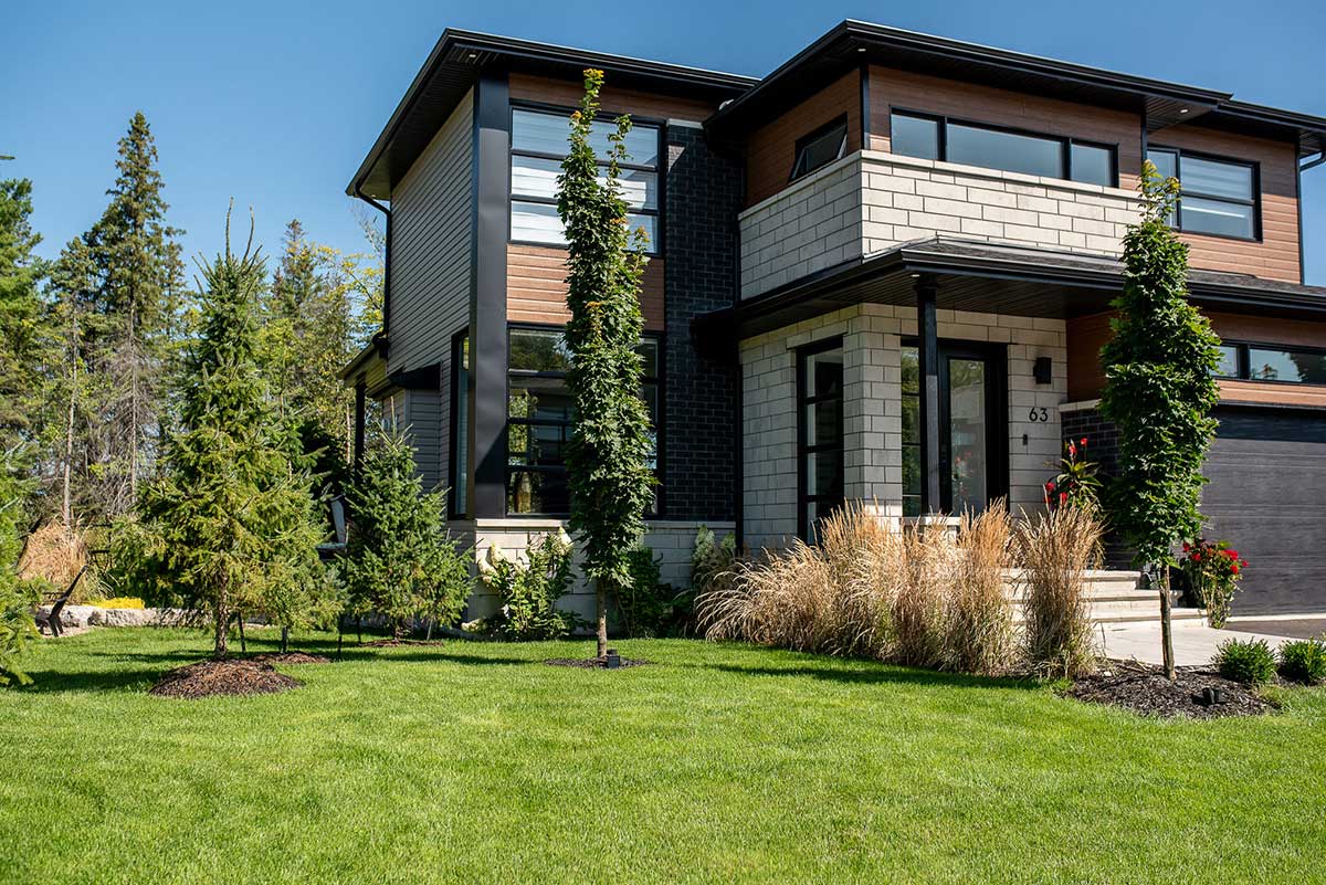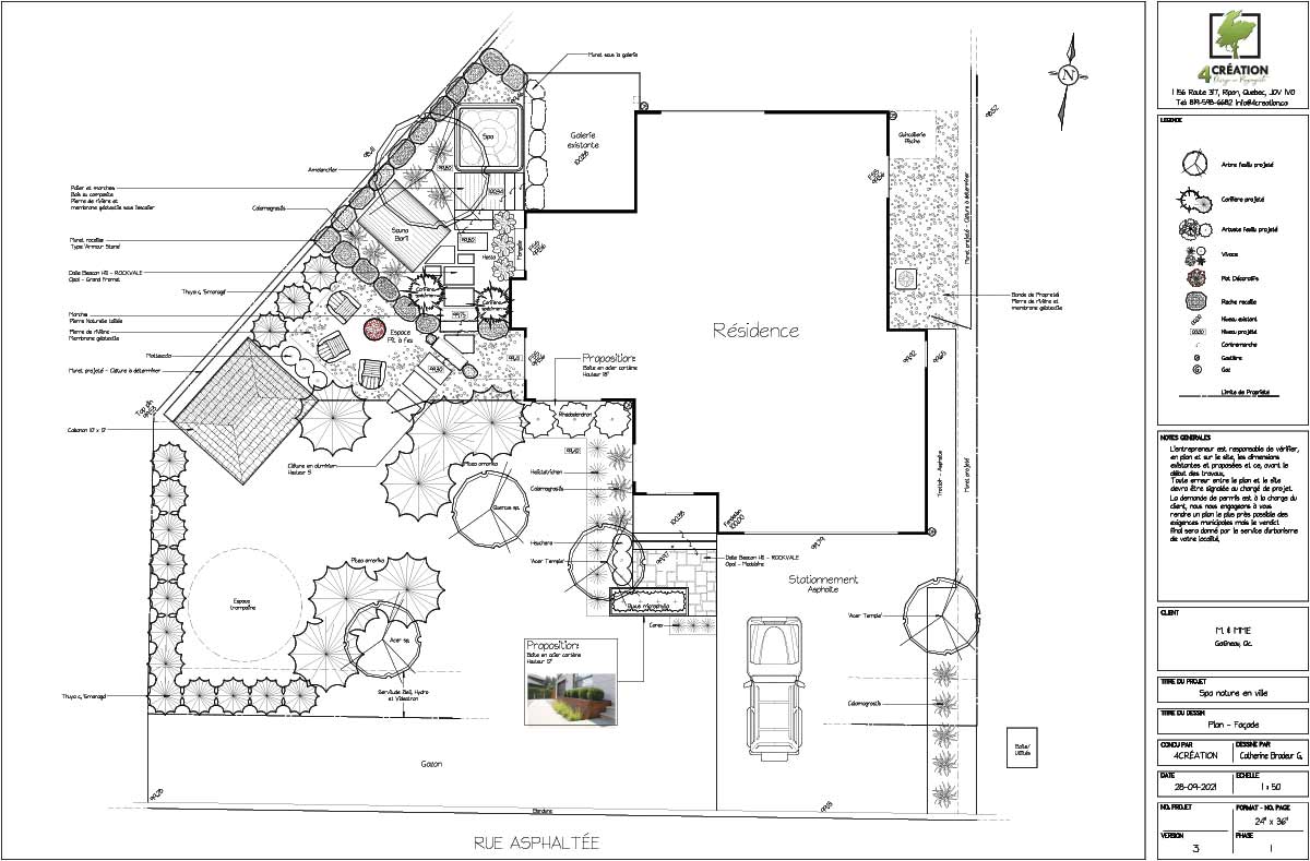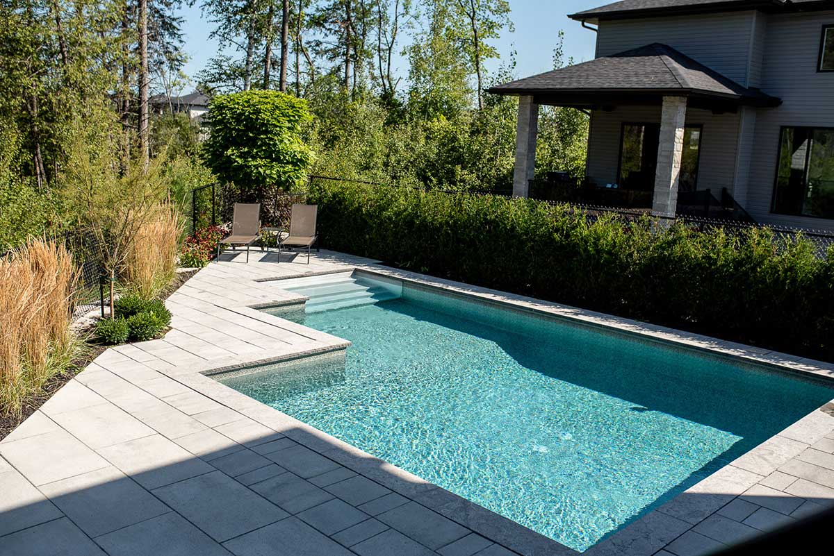 Pour créer de l'intimité autour de la piscine, des conifères ont été stratégiquement positionnés, tandis que les grands arbres en cour latérale créeront une atmosphère naturelle tout en formant une barrière visuelle, offrant ainsi une séparation avec la rue. De plus, nous avons joué avec les niveaux de terrain pour recréer un effet montagneux, renforçant l'intégration harmonieuse de l'espace.