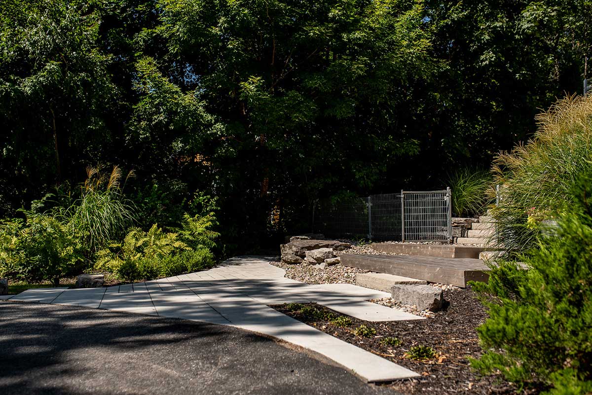 La cour, initialement composée uniquement de plates-bandes, a été transformée par l’ajout d’espaces gazonnés, créant une impression d'ouverture et de légèreté. Les surfaces en béton ont été réduites et remplacées par une végétation diversifiée, contribuant à diminuer l’effet de chaleur tout en rehaussant l'esthétique globale de l'espace.