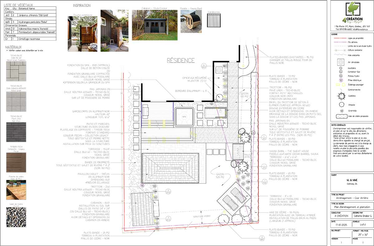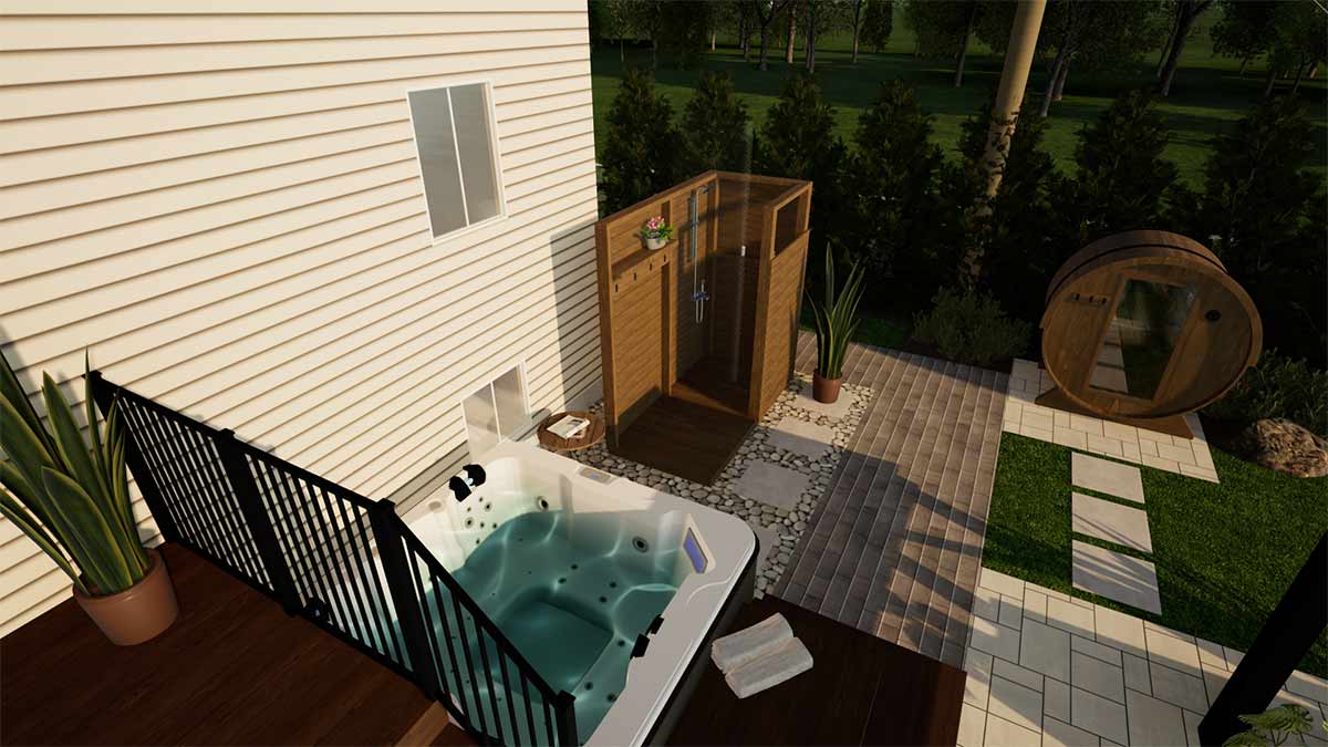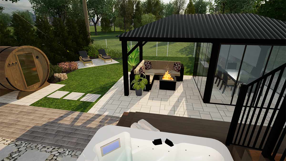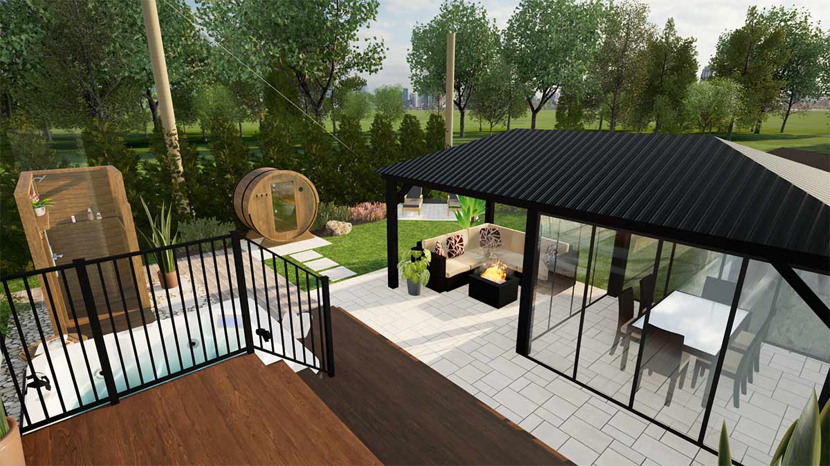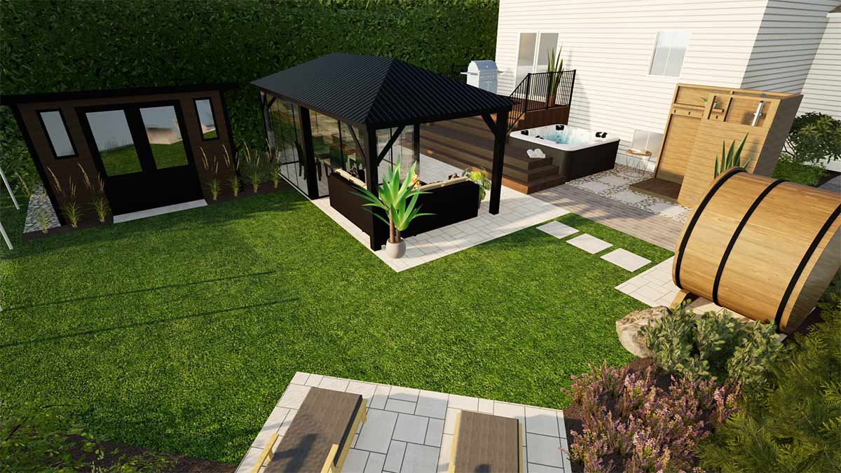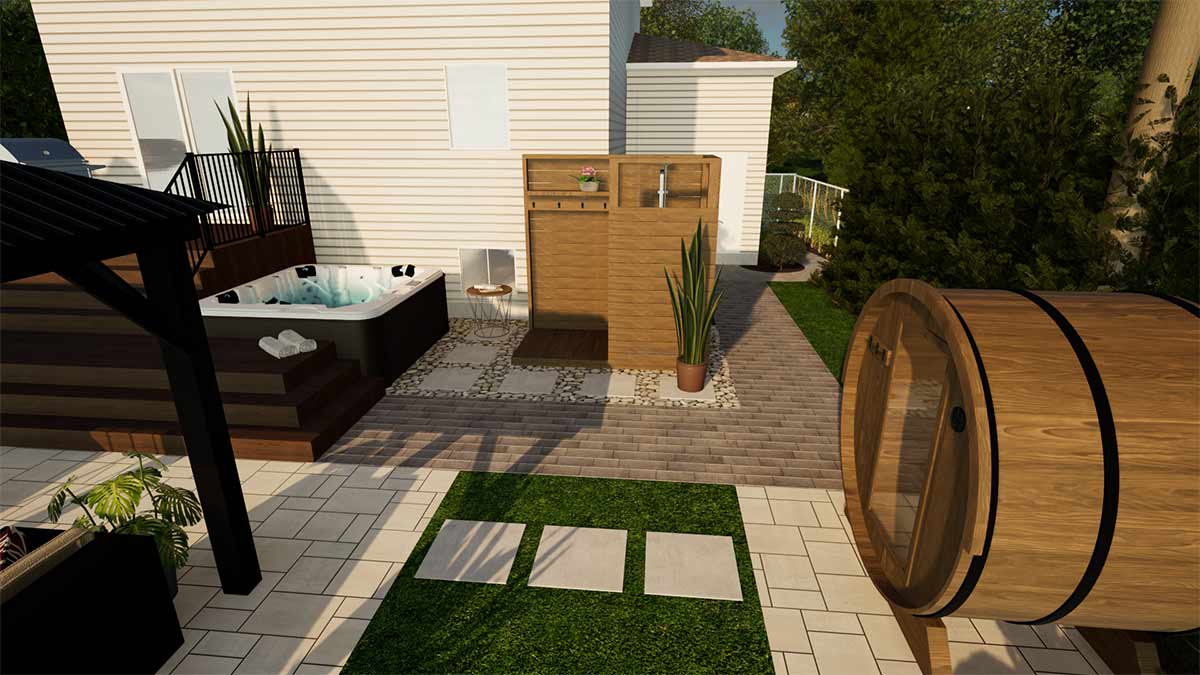 Ce projet de réaménagement transforme une petite cour citadine en un véritable havre de détente, conçu pour profiter pleinement de la vie en extérieur tout au long de l’année. Les propriétaires souhaitaient un espace offrant à la fois fraîcheur et bien-être : une douche extérieure et un spa quatre saisons permettent de se rafraîchir ou de se relaxer à tout moment, tandis qu’un sauna complète l’expérience de bien-être. Un espace couvert permet de manger et se détendre en toute convivialité, à l’abri des moustiques, prolongeant ainsi le temps passé dehors. La cour intègre également un espace bain de soleil et un nouveau cabanon, le tout judicieusement agencé dans un espace restreint pour maximiser confort, fonctionnalité et esthétisme.
